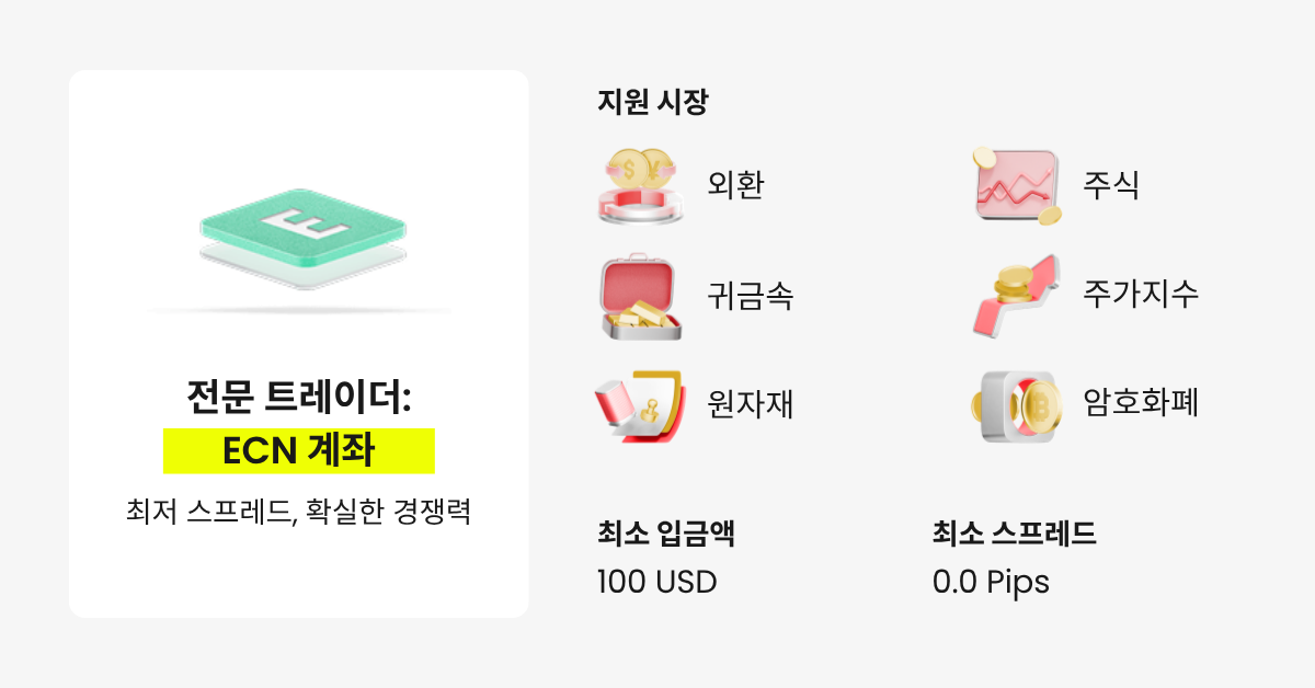 모든 계좌 유형 중에서 ECN 계좌는 가장 경쟁력 있는 가격 구조를 제공하는 것으로 알려져 있습니다.