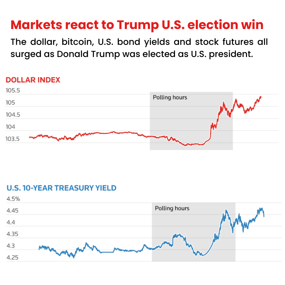 The election result sparked a surge in “Trump trades,” pushing U.S. Treasury yields higher, with the 10-year note reaching a four-month high at 4.479%. Bitcoin also hit a record above USD 76,000, while the dollar notched its largest single-day gain since September 2022.