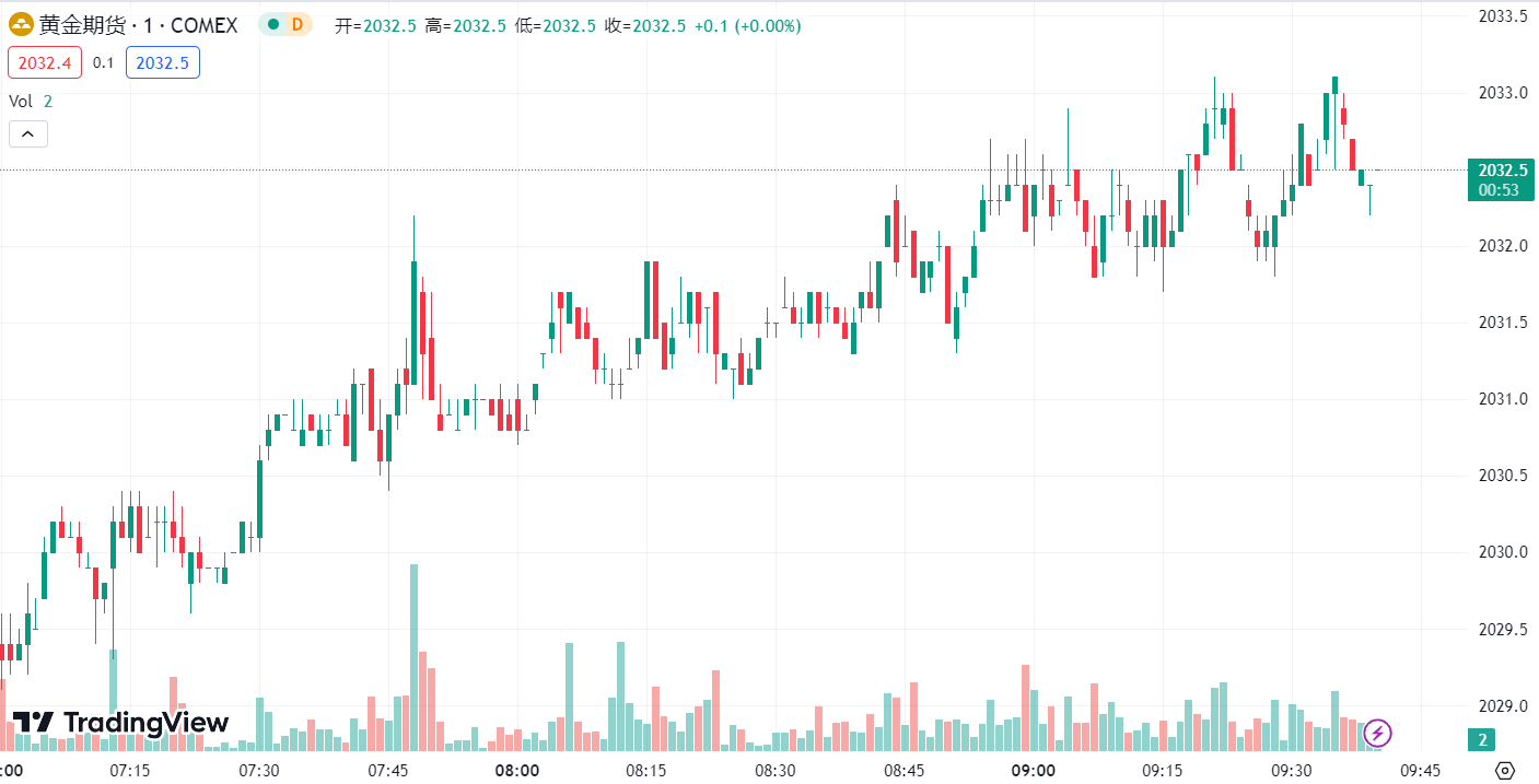 周三,现货黄金先涨后跌,报收 2029.8 美元/盎司,跌幅 0.16%, 黄金期货价格基本持平,稳定在每盎司 2033.30 美元水平。