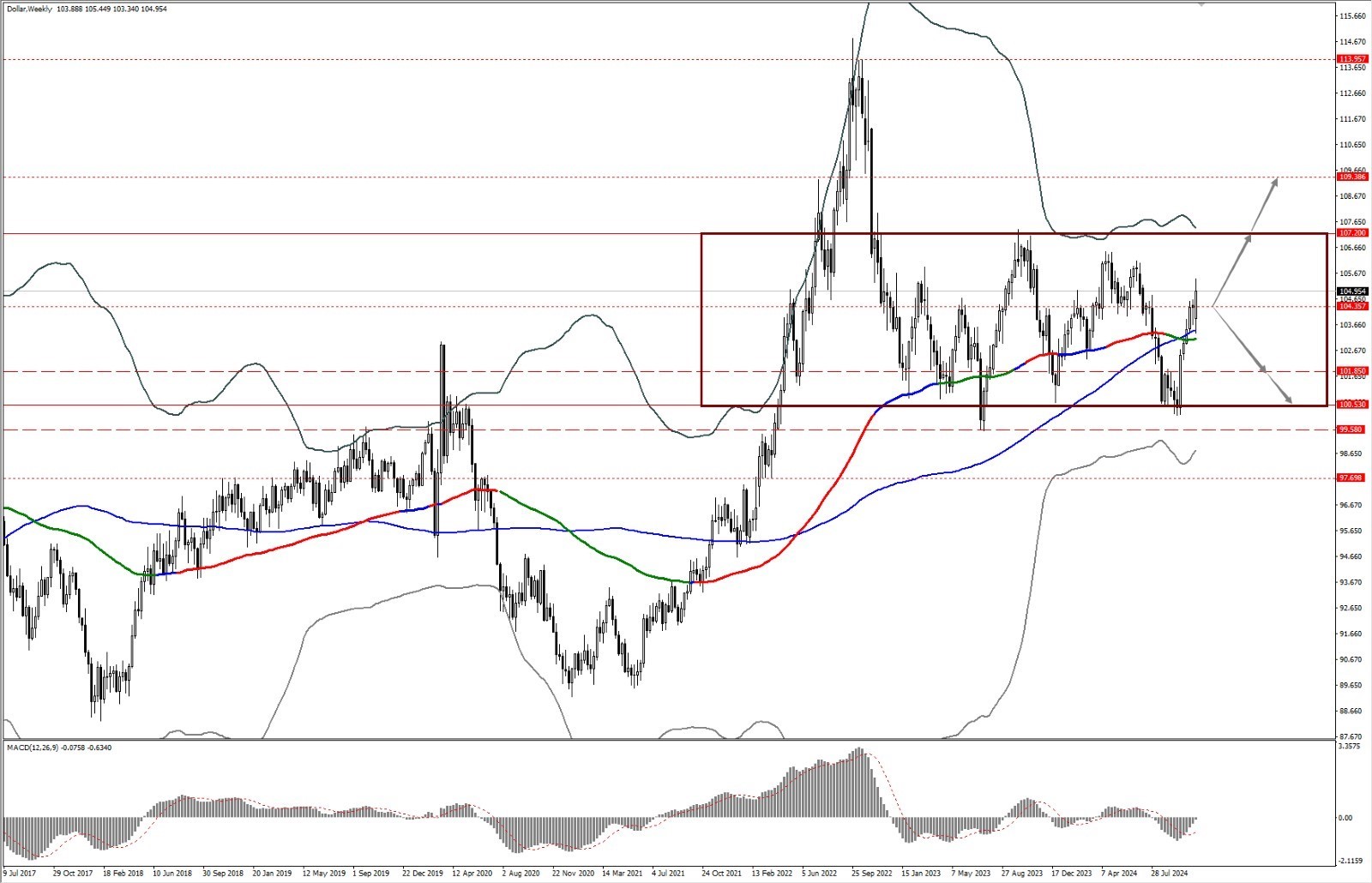 - 本周关注宽幅震荡区间 100.53 到 107.20 区间内部中枢位 104.35 一线;