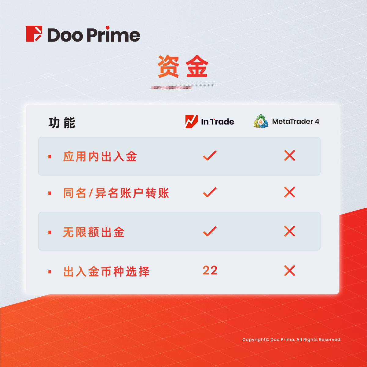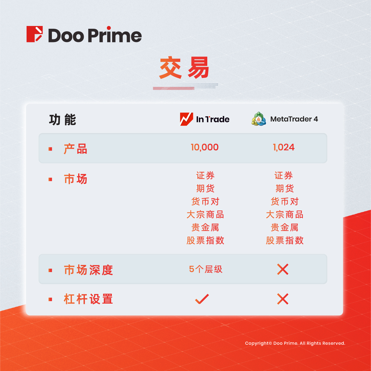 凭借强大的金融科技基础设施、密切的合作伙伴关系、资深的技术团队,Doo Prime 始终为投资者提供安全可靠的交易环境、具有竞争力的交易成本、极速的交易执行通道,在 MT4、MT5、TradingView、InTrade 等多个行业领先的交易终端上提供超过 1 万种交易产品,支持 10 种不同货币的存取款方式,7*24 小时的多语言客户服务。