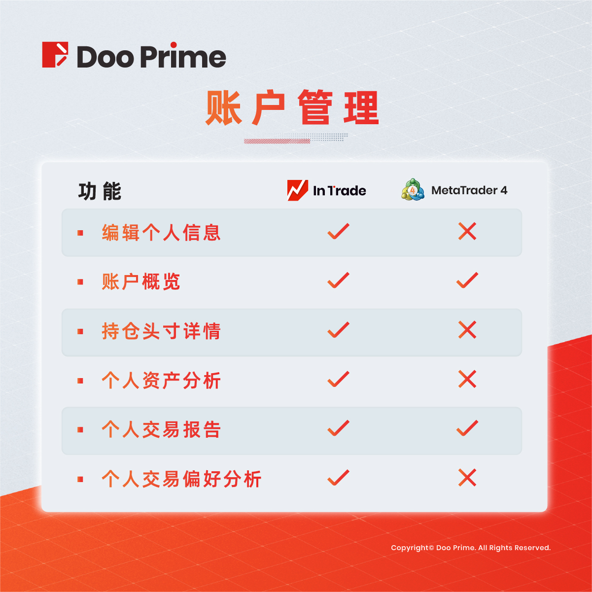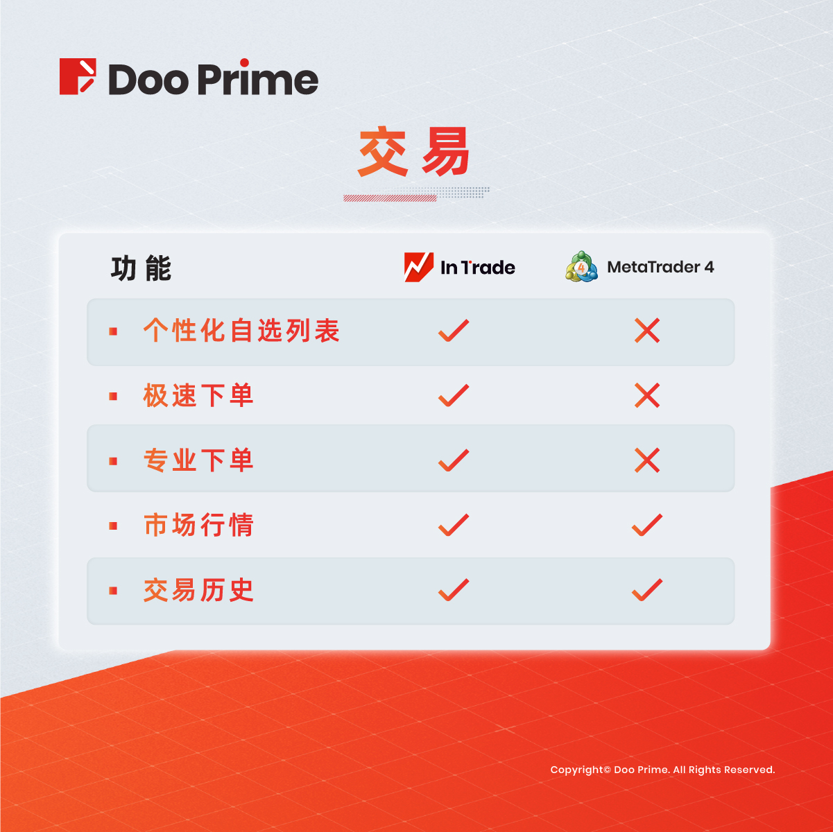Doo Prime InTrade 比 MT4 有更多的优势和更便捷的操作功能,越来越多的客户喜欢 Doo Prime InTrade 的人性化界面和灵活性。