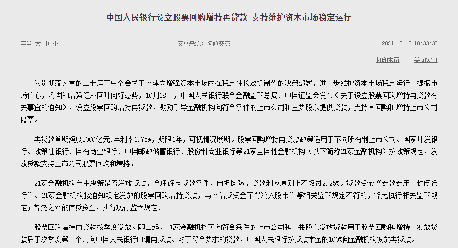 同日,中国人民银行联合金融监管总局、中国证监会发布《关于设立股票回购增持再贷款有关事宜的通知》,设立股票回购增持再贷款,激励引导金融机构向符合条件的上市公司和主要股东提供贷款,支持其回购和增持上市公司股票。再贷款首期额度 3000 亿元,年利率 1.75%,期限 1 年,可视情况展期。