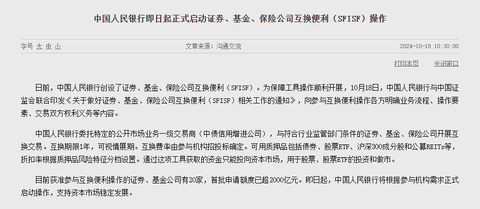 10 月 18 日,中国人民银行官网显示,中国人民银行与中国证监会联合印发《关于做好证券、基金、保险公司互换便利(SFISF)相关工作的通知》,向参与互换便利操作各方明确业务流程、操作要素、交易双方权利义务等内容。