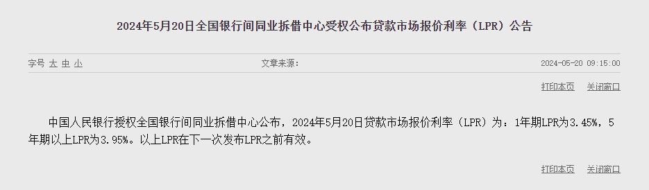 5 月 20 日,中国人民银行授权全国银行间同业拆借中心公布最新贷款市场报价利率(LPR),1 年期 LPR 为 3.45%,与前值持平;5 年期以上 LPR 为 3.95%,同样较前值不变。