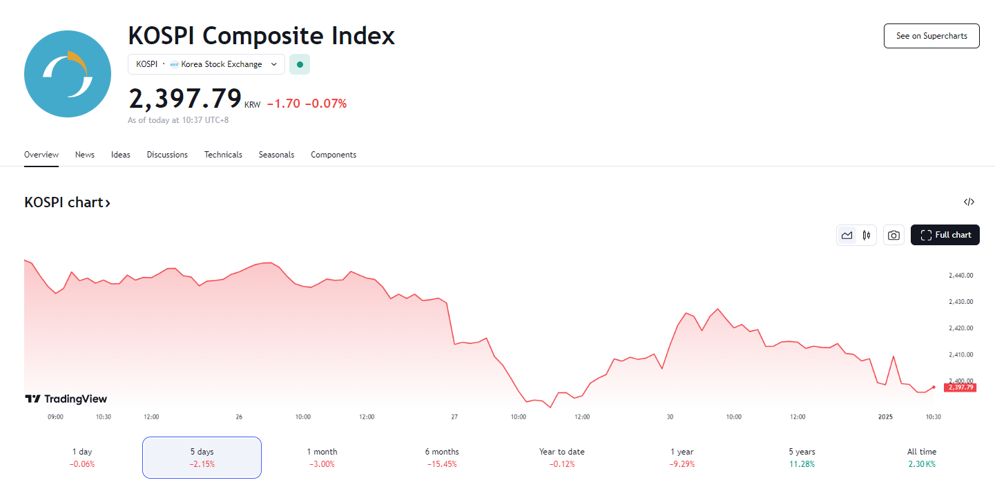 目前韩国面临几十年来最严峻的政治动荡,导致韩元跌至 2009 年以来的最低水平,并令韩国股市承压。2024 年,韩元兑美元累计下跌 14.52%,为 2008 年以来最大年度跌幅,跌破 1480 韩元兑换 1 美元,为 2009 年以来最低;韩国综指去年累计下跌 9.63%,2025 年首个交易日,韩国 KOSPI 指数五连跌。