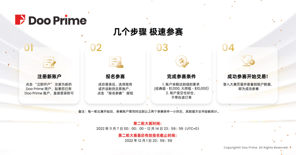 2022年 S3 #DooTrader 慈善杯全球交易大赛第二轮比赛将于 12 月 14 日 收官,报名将于本周四 12 月 1 日 截止,请各位选手抓住最后机会,展示你真正的实力,同时还可以有更多机会与业内高手进行技艺切磋,更有丰厚奖金等你来战,,把握时机,也许你就是新晋 #DooTrader 之星。