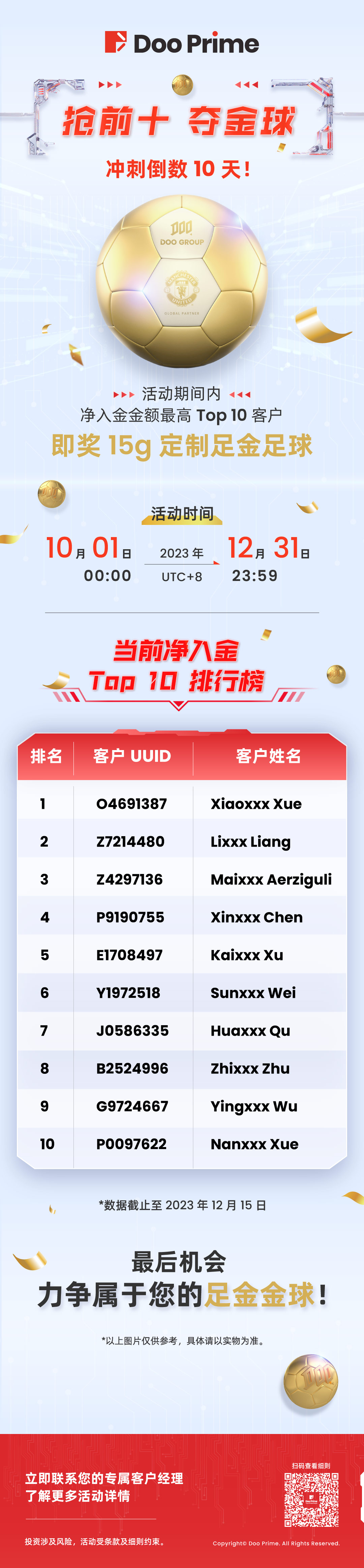 Doo Prime “抢前十,夺金球” 活动最后 10 天,立即冲刺 Top 10 净入金排行榜!