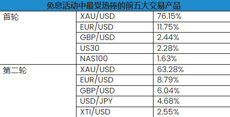上一轮免息活动相比,本轮活动中最受热捧的前五大产品为 XAU/USD、EUR/USD、GBP/USD、USD/JPY 以及 XTI/USD。