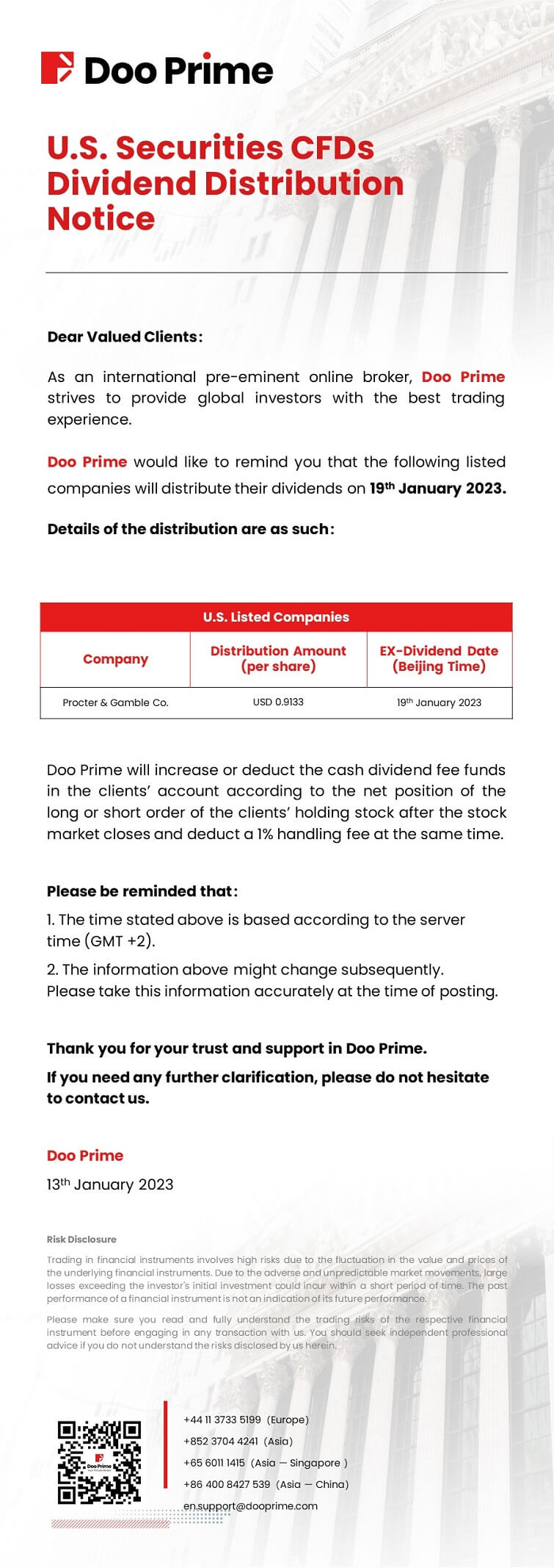 Doo Prime U.S. Securities CFDs Dividend Distribution Notice