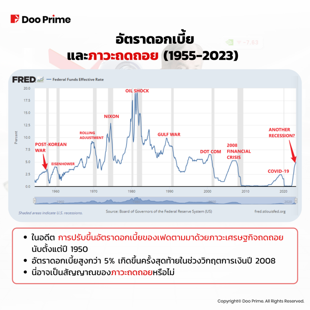 แผนภูมิด้านบนแสดงให้เห็นว่าเราอาจอยู่ในช่วงปลายของวัฏจักรตลาดโดยที่อัตราดอกเบี้ยยังคงเพิ่มสูงขึ้น นอกจากนี้ เหตุการณ์ในอดีตยังแสดงให้เราเห็นว่าเราไม่สามารถเพิกเฉยกับสิ่งที่อาจเกิดขึ้นตามมาได้ หากเป็นกรณีของเราในตอนนี้ อาจเป็นเพียงการรอเวลาก่อนที่บางอย่างจะ “พัง” ในระบบเศรษฐกิจและทำให้เกิดภาวะถดถอยตามมา