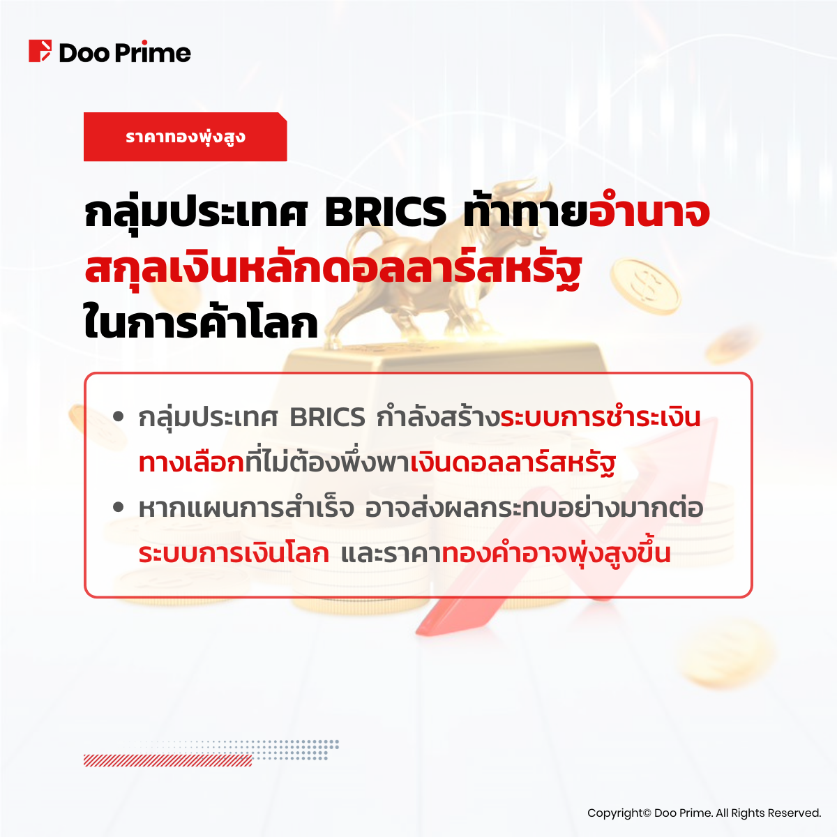 จากการคว่ำบาตรของสหรัฐฯ ต่อรัสเซีย กลุ่มประเทศ BRICS (บราซิล รัสเซีย อินเดีย จีน และแอฟริกาใต้) กำลังนำกระแสโลกเปลี่ยนจากเงินดอลลาร์สหรัฐโดยการสร้างทางเลือกในการค้าโดยไม่ต้องพึ่งเงินดอลลาร์สหรัฐ หากทำสำเร็จ อาจส่งผลกระทบอย่างมากต่อระบบการเงินโลก และราคาทองคำอาจพุ่งสูงขึ้น