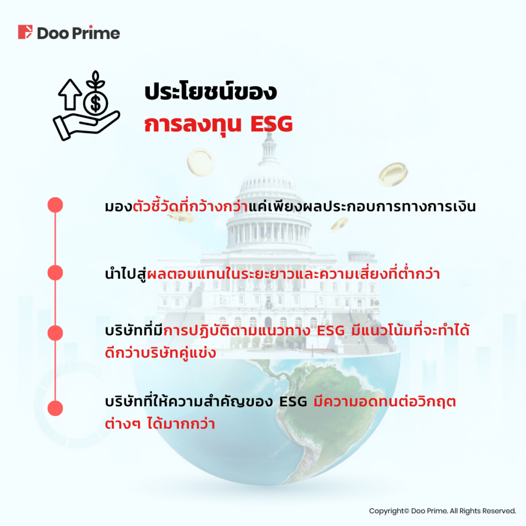 ประการสุดท้าย การลงทุน ESG สามารถช่วยให้นักลงทุนจัดแนวการลงทุนให้สอดคล้องกับค่านิยมและหลักการที่ยึดถือ ซึ่งสามารถเติมเต็มความต้องการและให้ผลตอบแทนคืนกลับมาด้วย