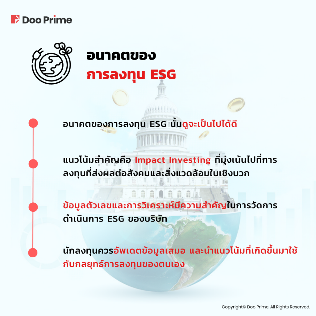 ในขณะที่โลกยังคงเผชิญกับความท้าทายระดับโลก เช่น การเปลี่ยนแปลงสภาพภูมิอากาศและความไม่เท่าเทียมกันทางสังคม การลงทุน ESG มีแนวโน้มที่จะมีบทบาทสำคัญมากขึ้นในการกำหนดอนาคตของการเงิน