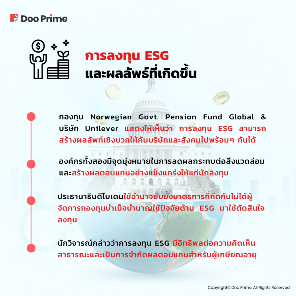 ตัวอย่าง เช่น Norwegian Government Pension Fund Global แสดงให้เห็นว่าการลงทุน ESG สามารถส่งผลดีต่อบริษัทและสังคมได้อย่างไร