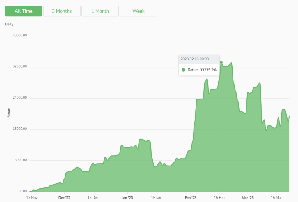 ผู้ให้ Signal ที่ชื่อว่า “Xiaoniu No. 0001” (小牛0001号) ก่อตั้งขึ้นเมื่อวันที่ 4 ตุลาคม 2022 ซึ่งนับตั้งแต่ได้ก่อตั้งมา อัตราผลตอบแทนการลงทุนก็เติบโตเป็นอย่างมา อัตราผลตอบแทนโดยรวมอยู่่ในระดับดีที่สุดเมื่อเทียบกับผู้ให้ Signal อื่นๆ จริงๆ แล้ว เมื่อวันที่ 16 กุมภาพันธ์ ที่ผ่านมา อัตราผลตอบแทนถึงจุดสูงสุดที่ 33,235.2% ซึ่งคิดเป็นการเติบโตอย่างก้าวกระโดดมากกว่า 330 ครั้ง