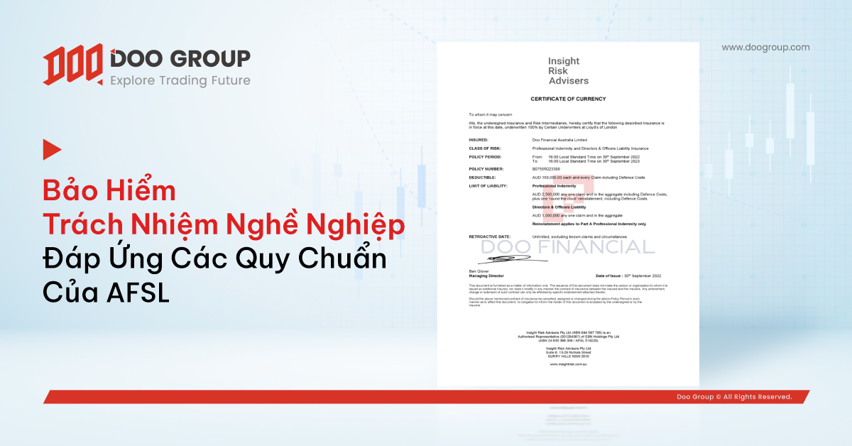 Ủy ban Chứng khoán và Đầu tư Úc (ASIC) đã đặt ra nhiều quy chuẩn mà AFSL – Giấy phép Dịch vụ Tài chính Úc phải đáp ứng nhằm đảm bảo thực thi theo đúng quy định đề ra. Mặc dù những quy chuẩn này đôi khi đòi hỏi tiến trình khá phức tạp, nhưng Doo Financial Australia Limited tin rằng điều tối quan trọng là phải tuân thủ đầy đủ các điều luật cùng quy định liên quan, trong đó bao gồm các thỏa thuận đền bù thỏa đáng. Thể theo đó, Doo Financial Australia Limited đã tiến hành mua Bảo hiểm Trách nhiệm nghề nghiệp (PII), được bảo đảm bởi các chuyên gia bảo hiểm hàng đầu thế giới tại Lloyd’s. PII đảm bảo được rằng, Doo Financial Australia Limited sở hữu đủ vốn tài chính để thực hiện các động thái bồi thường cho khách hàng trong các trường hợp có khiếu nại chống lại Doo Financial Australia Limited về việc tuân theo các điều khoản, điều kiện hoặc các điều khoản loại trừ.