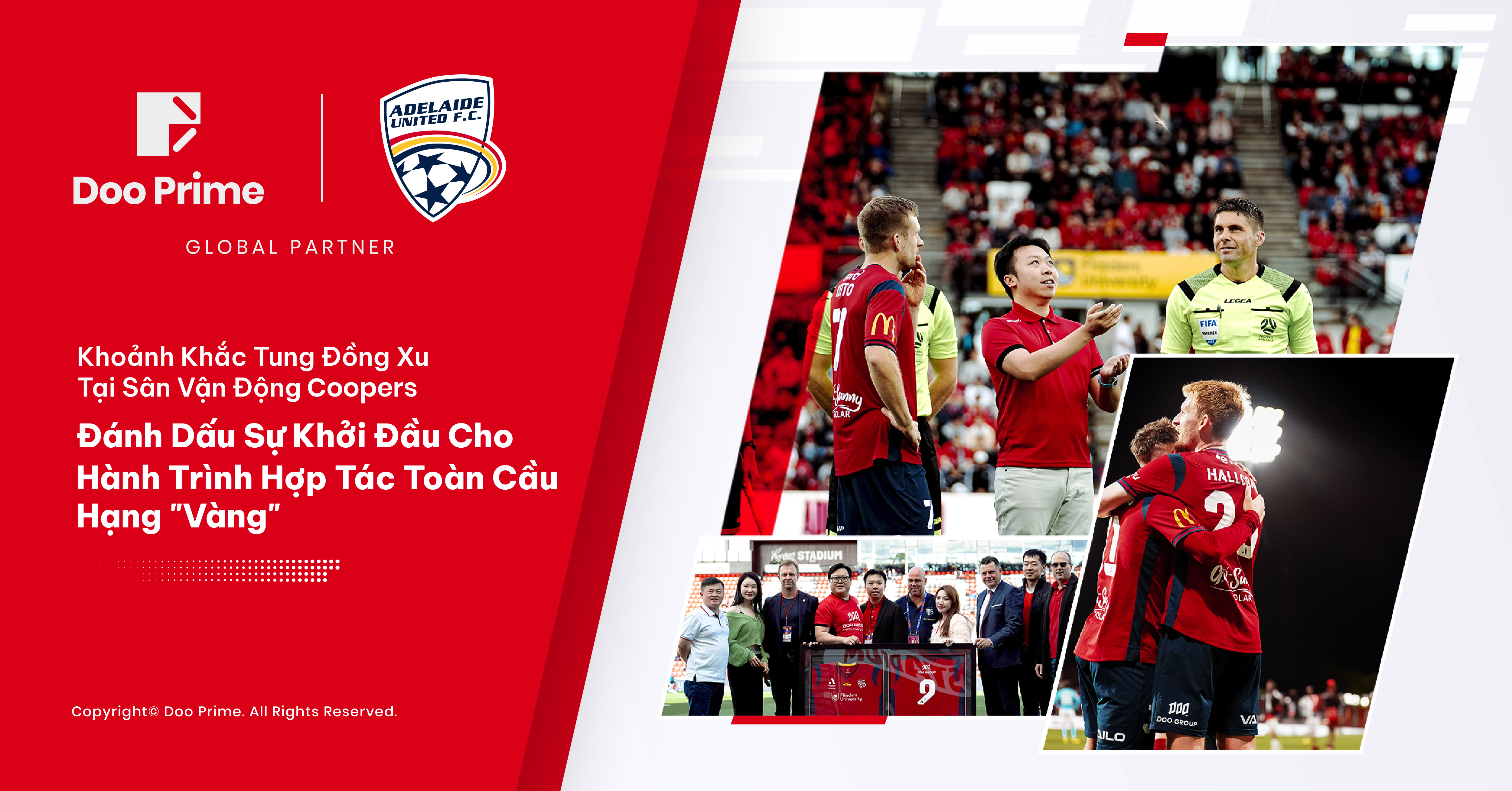 Vào ngày 29 tháng 10 năm 2023 vừa qua, sân vận động Coopers Stadium của Câu Lạc Bộ (CLB) Bóng Đá Adelaide United (AUFC) được bao trùm trong bầu không khí sôi động từ bốn phía. Tiếng hò reo của cổ động viên vang vọng khắp nơi không chỉ bởi chiến thắng đầy thuyết phục 6-0 của AUFC trước đội tuyển Melbourne City, mà còn bởi lễ kỷ niệm hợp tác giữa đội bóng với Doo Group. Cụ thể, sự kiện nhằm ra mắt mối quan hệ hợp tác giữa Tập đoàn Doo Group trong vai trò là Đối Tác Toàn Cầu Hạng Vàng của AUFC. Có thể nói, điều này đã chính thức đánh dấu một cột mốc mới của cả hai trên hành trình phát triển, đổi mới và vươn tới thành công.