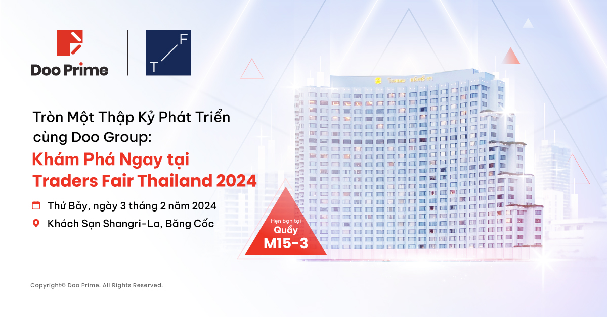 Doo Prime xin hân hoan thông báo sự trở lại của mình với tư cách nhà tài trợ chính thức trong Triển Lãm Tài Chính Traders Fair Thailand 2024, được tổ chức tại Băng Cốc – thủ đô sôi động của “xứ sở chùa Vàng”. Sự kiện này cũng đánh dấu sự khởi đầu của hành trình tham gia chuỗi triển lãm giao dịch trên quy mô toàn cầu, với điểm đến đầu tiên là đất nước Thái Lan xinh đẹp trong năm mới 2024.