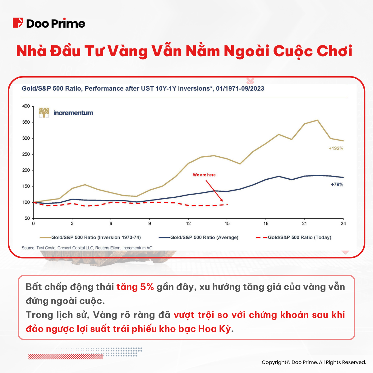 Trong tương lai, xu hướng tăng giá của vàng vẫn mạnh mẽ. Biểu đồ dưới đây cho thấy rằng vàng rõ ràng là đã vượt trội so với cổ phiếu khi đường cong lợi suất đảo ngược.