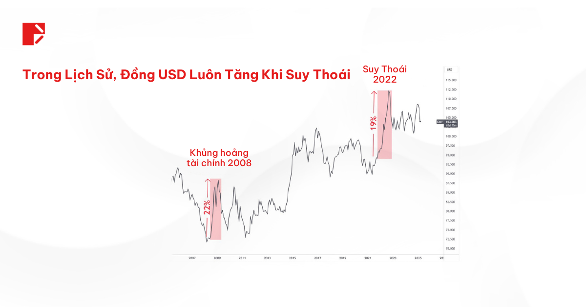 Trong cuộc khủng hoảng tài chính năm 2008, Chỉ số Đô la Mỹ (DXY) đã tăng vọt hơn 20%. Trong cuộc suy thoái COVID năm 2020, đồng đô la đã tăng khoảng 7% và trong cuộc suy thoái năm 2022, đồng đô la đã tăng khoảng 20%. Theo thông lệ, sự tăng trưởng mạnh mẽ của đồng đô la là dấu hiệu cho thấy sự “chớm nở” của một cuộc suy thoái thực thụ.